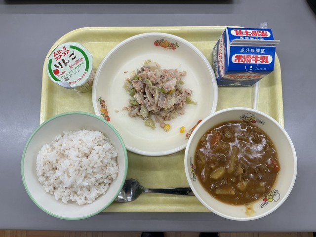 今日の献立は、むぎごはん、牛乳、ビーフカレー、れんこんサラダ、りんごヨーグルトでした。