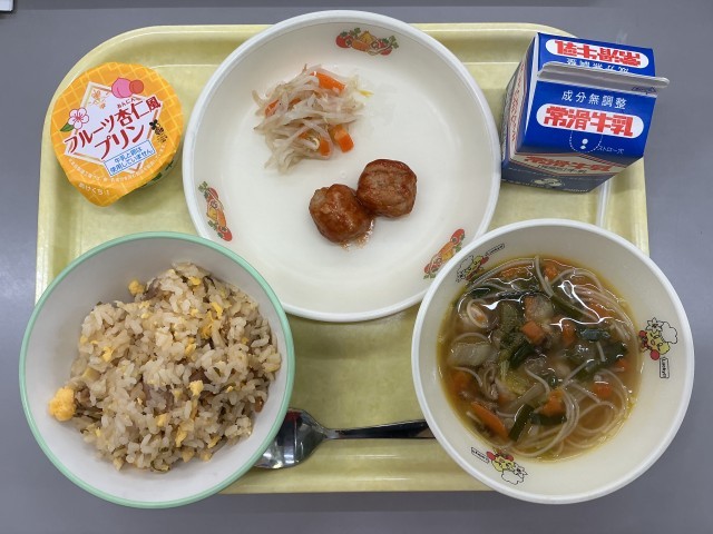 今日の献立は、チャーハン、牛乳、肉団子のケチャップあんかけ、もやしの中華あえ、ビーフンスープ、
