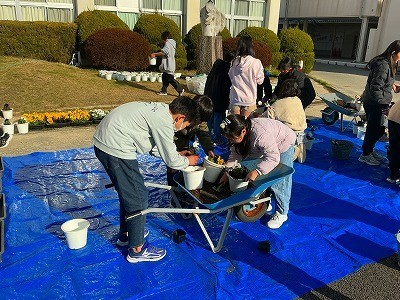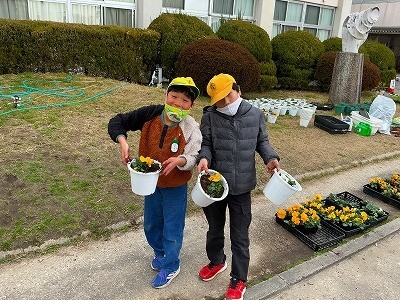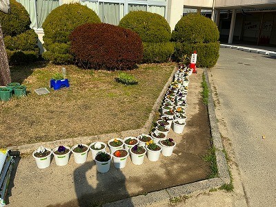13日(火)に卒業式の式場を飾る花の植え替えを一人2鉢行いました。