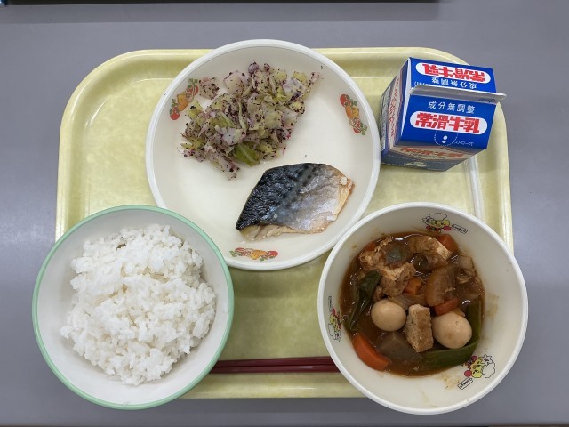 今日の献立は、ごはん、牛乳、さばの塩焼き、煮みそ、キャベツのゆかりあえでした。