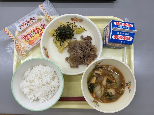 今日の献立は、ごはん、牛乳、牛肉と玉ねぎのすき焼き風いため、キャベツと味のりのサラダ、