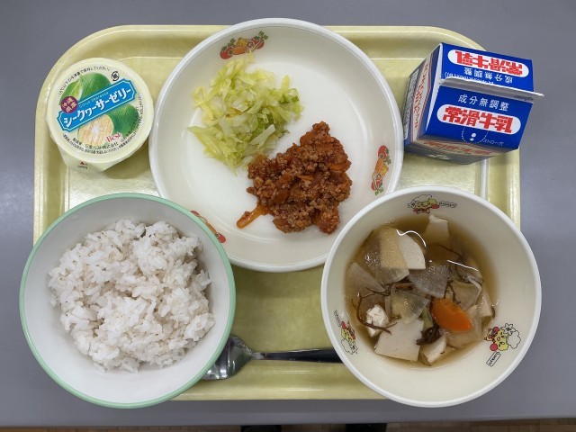 今日の献立は、むぎごはん、牛乳、タコライス(タコミート、キャベツソテー)、もずく汁、
