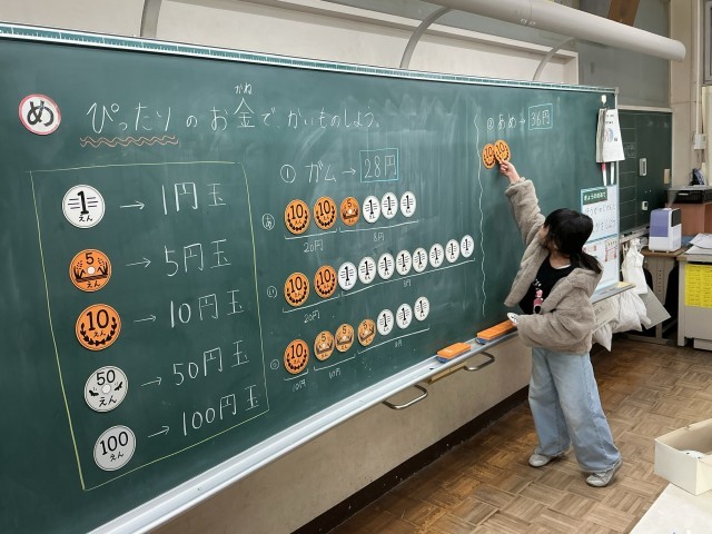 この日はお金を用いて、どのようにコインを出せばぴったりの金額で買えるかを考えています。