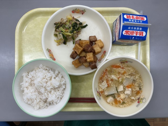 今日の献立は、むぎごはん、牛乳、まぐろと高野豆腐の揚げ煮、白菜の梅おかかあえ、かきたま汁でした。