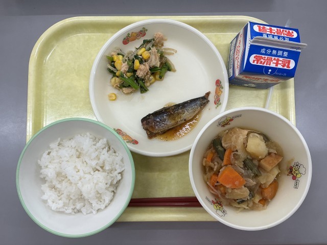 今日の献立は、ごはん、牛乳、いわしのしょうが煮、じゃがいものうま煮、菜花のあえものでした。