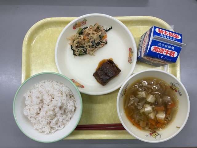 今日の献立は、むぎごはん、牛乳、宗田かつおのおかか煮、小松菜のおひたし、沢煮椀でした。