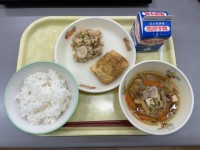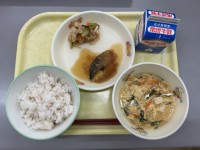 今日の献立は、鶏飯(アルファ化米)、牛乳、いわしの梅煮、きゅうりとたくあんのごまあえ、