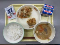 今日の献立は、ごはん、牛乳、れんこんのはさみ揚げ、豚肉と大根の煮物、小松菜のごまあえでした。