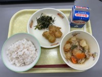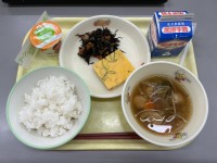 今日の献立は、むぎごはん、牛乳、ハンバーグのたまねぎソースかけ、ひじきとたけのこの炒め物、