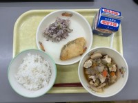 今日の献立は、むぎごはん、牛乳、いわしのかば焼き、切り干し大根と里芋の煮物、実だ...