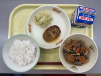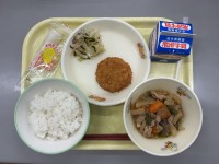 今日の献立は、ごはん、牛乳、里芋コロッケ、大根と豚肉のうま煮、キャベツの昆布あえ...