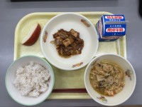 今日の献立は、むぎごはん、牛乳、親子煮、キャベツと生揚げのみそいため、りんごです...