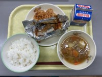 今日の献立は、ごはん、牛乳、鮭のしょうゆこうじ焼き、五目きんぴら、さつま汁でした...