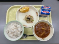今日の献立は、むぎごはん、牛乳、米粉のハヤシライス、豆まめサラダ、いよかんでした...