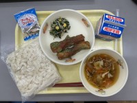 今日の献立は、きしめん、牛乳、五目汁、ちくわの米粉磯辺揚げ、春菊とささみのおひた...