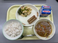 今日の献立は、むぎごはん、牛乳、焼きウインナー、カレー、カリフラワーサラダでした...