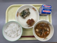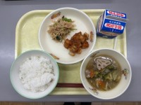 今日の献立は、ごはん、牛乳、鶏肉の竜田揚げ、春菊とツナのあえもの、もずくのみそ汁...