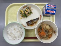 今日の献立は、ごはん、牛乳、さばの塩こうじ焼き、にんじんとツナのいためもの、鶏団...