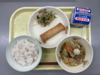今日の献立は、むぎごはん、牛乳、愛知の野菜入り春巻き、八宝菜、もやしの中華あえで...