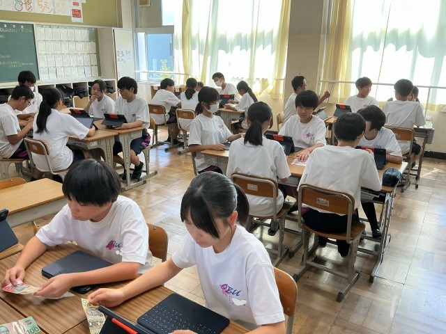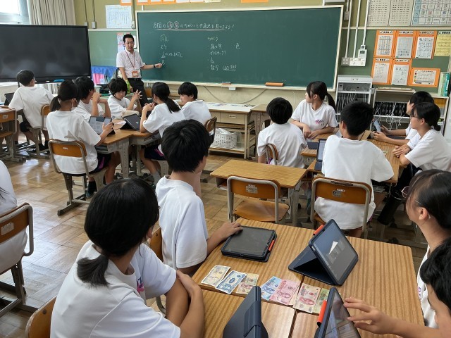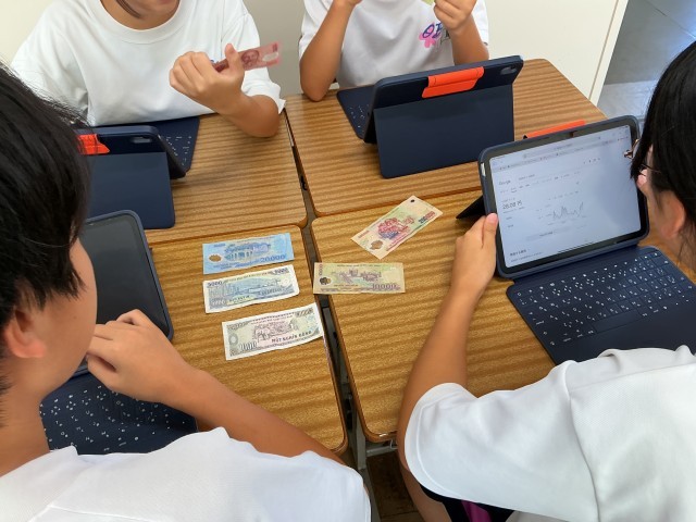 海外の通貨の違いと共通点を見つけよう! 公開日 2025/09/22 更新日 2025/09/22 日々の様子 1年生の英語の授業では海外の通貨の違いと共通点を見つける授業をしていました。各国の通貨(紙幣)を手にしながら話し合い活動を行なっています。これ、なんと本物の通貨です。「お札の人がみんな同じ!」「オーストラリアとカナダは同じ単位だ」「紙の質が全然違うし数字も違うね」海外の通貨には、その国の歴史的な背景も影響しているようです。海外への興味・関心が高まる授業でした。 +4