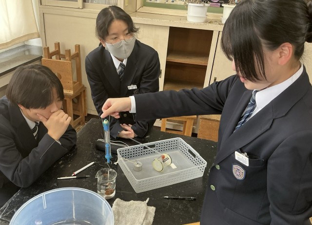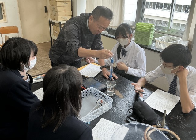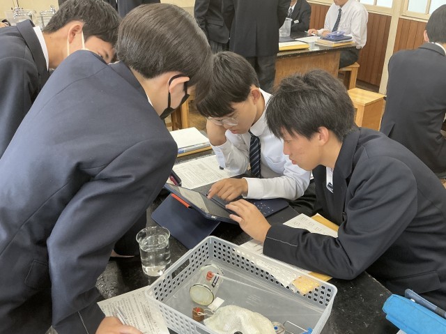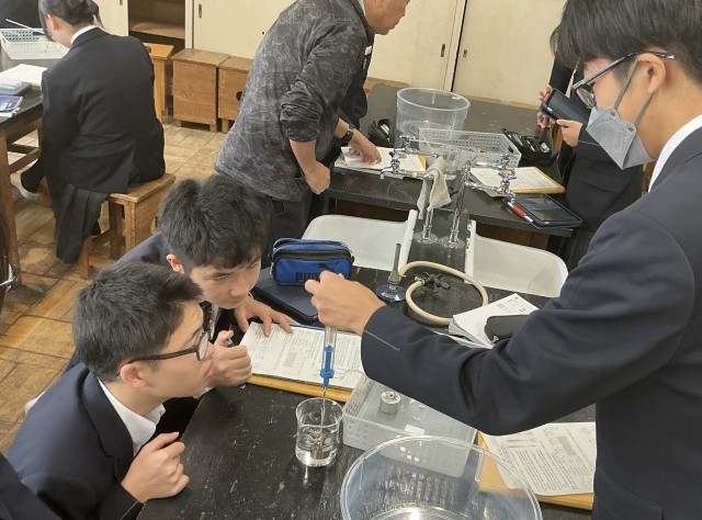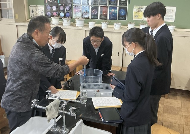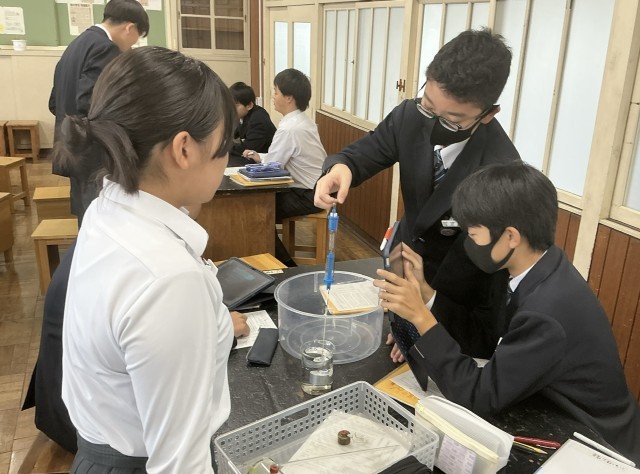浮力の大きさについて調べています 公開日 2025/10/24 更新日 2025/10/24 日々の様子 3年生は理科の実験を理科室で行っていました。実験をして、水中に沈んだ物体の体積と浮力の大きさにはどのような関係があるかを考えているようです。半分水中、浅い水中、深い水中と沈め方を変えて調べています。班で協力してバネばかりの示す値を読み取る姿が印象的でした。 +6