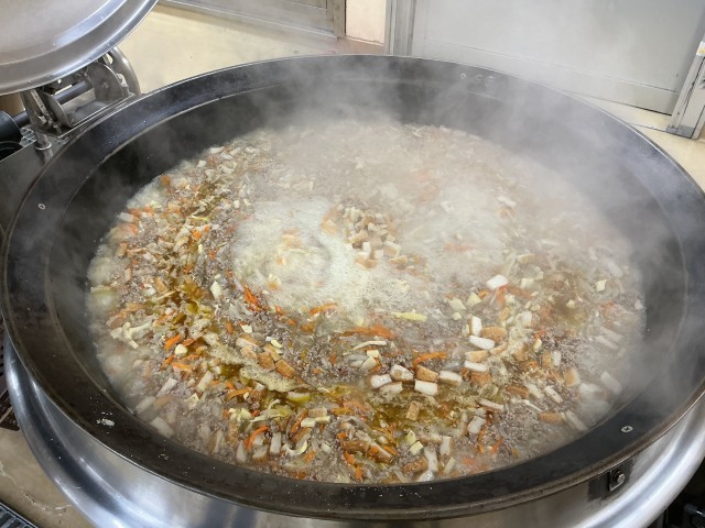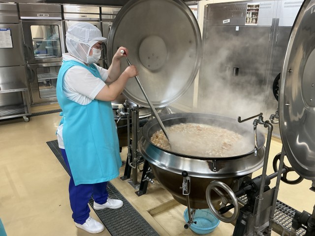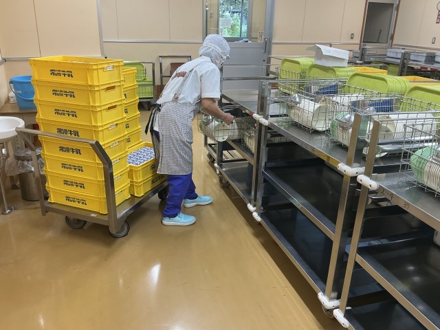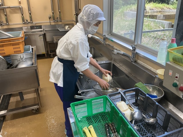 調理室と洗浄室、そして配膳室とそれぞれの部屋で同時に作業をしていて、手際の良さが際立っています。