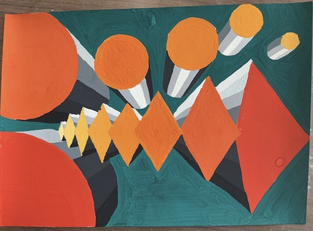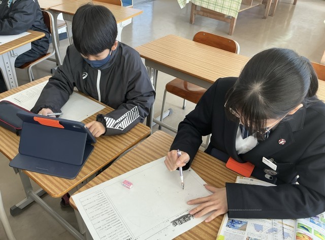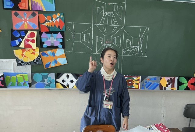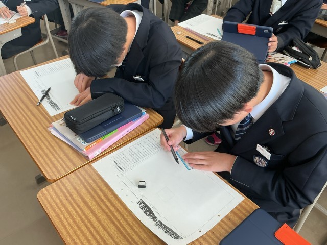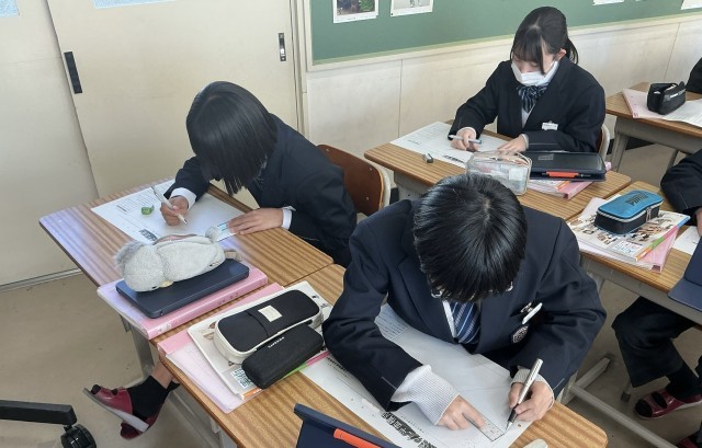 透視図法を使った平面構成 公開日 2025/12/09 更新日 2025/12/09 日々の様子 2年生は美術の授業で透視図法を使った平面構成の構想を練っていました。平面構成とは形やバランスを見ながら色彩を組み合わせ、一つの作品を作り上げることです。透視図法にシンメトリーやリピテーションなどの構成美の要素を取り入れていきます。それが難しくもあり工夫のしどころでもあります。完成した作品は毎年、校内に掲示されています。今年はどのような作品が見れるか楽しみです。 +7