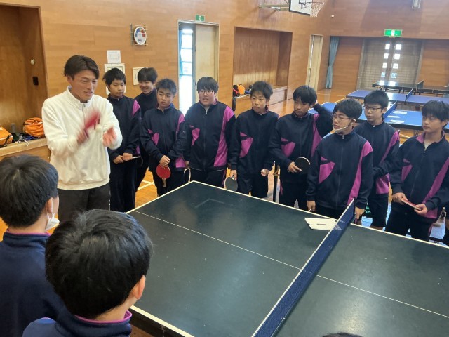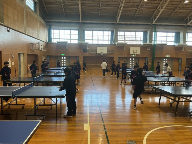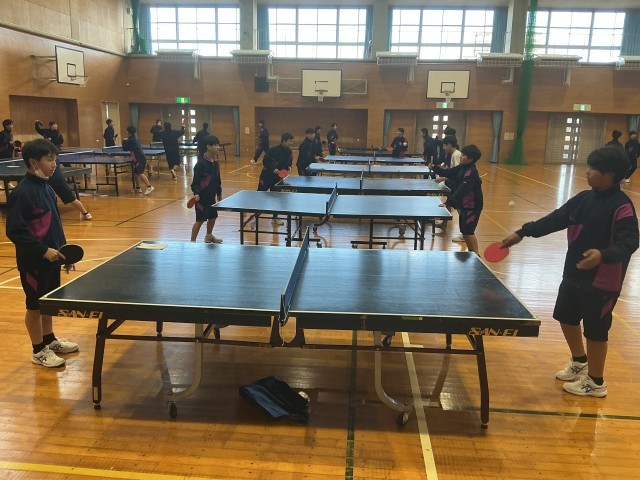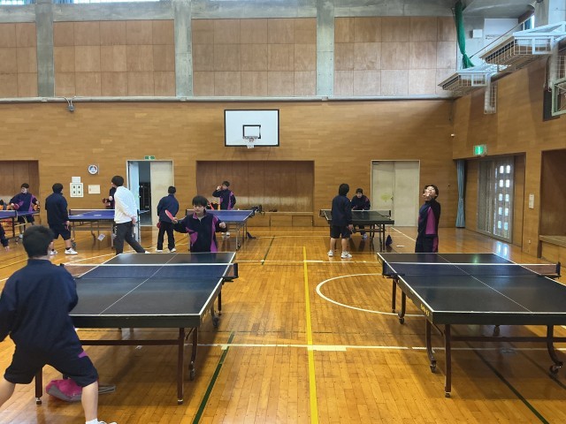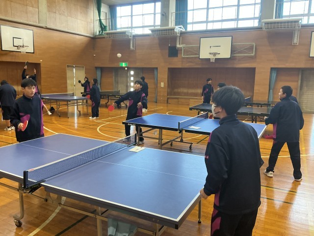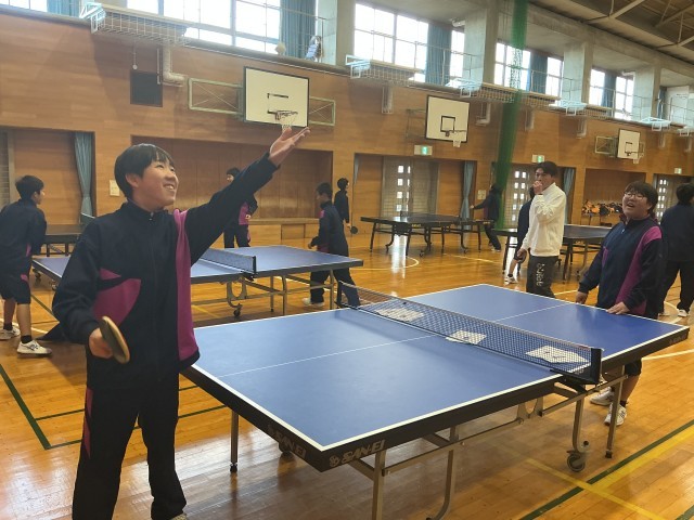 ラリーの始まりは 公開日 2026/01/21 更新日 2026/01/21 日々の様子 1年生は保健体育の授業で卓球の授業をしていました。今日の授業で大切にしていることは、速いサーブを打つことではありません。相手が打ちやすく、ラリーが長く続くための「思いやりサーブ」です。「はい、いくよ!」ふわりと浮かせたサーブでラリーを始める生徒たち。「相手への配慮」を込めてボールを繋ぎます。体育館にはピンポン球の音と一緒に温かい笑い声が広がっていました。 +6