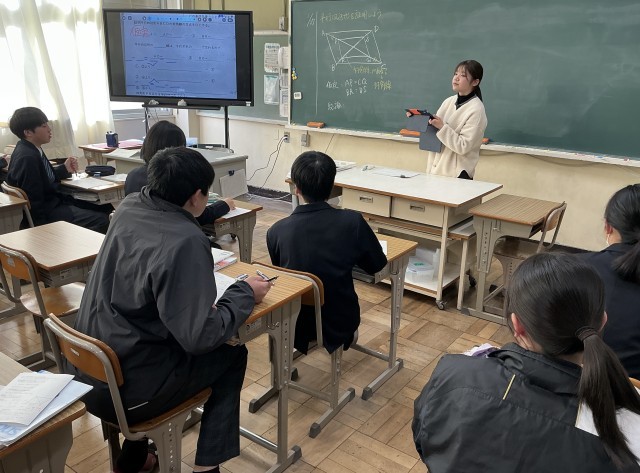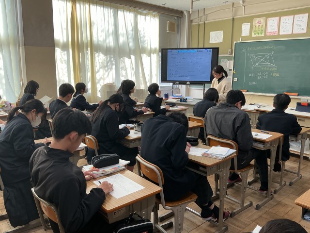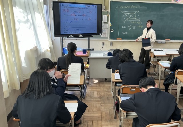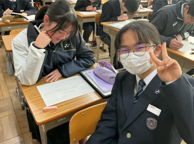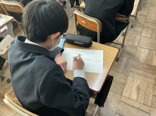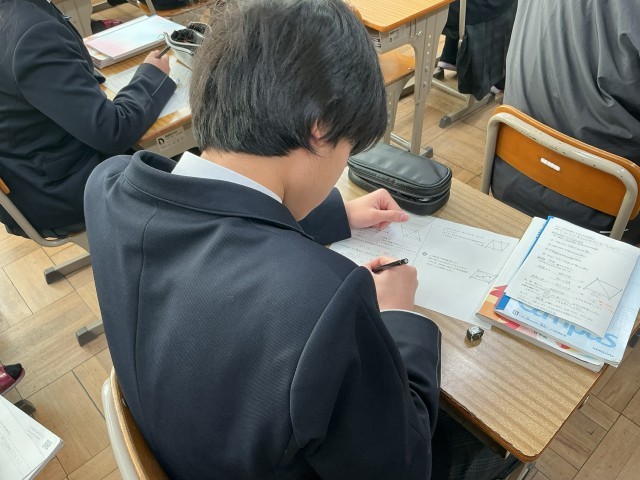 一筋の根拠を見つけだす 公開日 2026/01/27 更新日 2026/01/27 日々の様子 2年生は数学の授業で証明の学習をしていました。今日挑むのは平行四辺形になるための条件の証明です。「今のところ、大丈夫!」「国語っぽくて苦手…」「まぁまぁ、簡単ですね」「なぜそうなるのか」を問い続け、一文字一文字に納得の跡を残しています。ペアワークで仲間に説明することで、自分の理解もさらに確かなものにしています。 +3