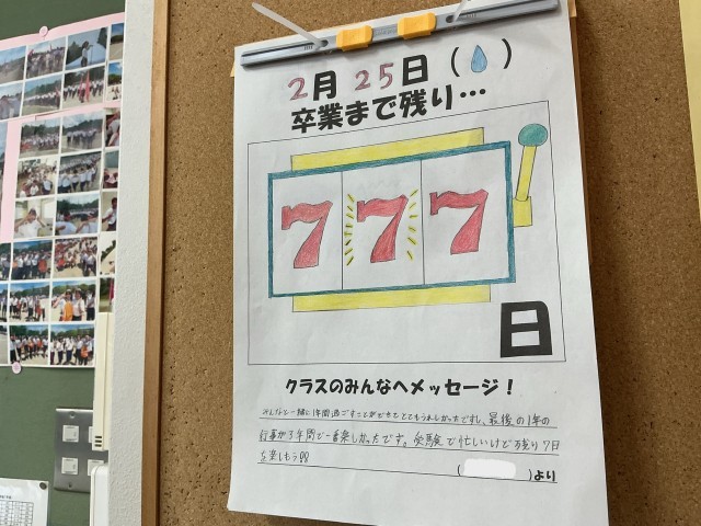 サクラサク日を信じて 公開日 2026/02/25 更新日 2026/02/25 日々の様子 今日は3年生の公立高校一般入試の当日。これまで積み重ねてきた努力の成果を発揮するため、多くの仲間たちがそれぞれの試験会場へと向かいました。会場に到着できたか、無事に受検を終えられそうか、職員室では先生たちも気にかけています。明日は入試という大きな山を越えて、成長した姿で登校してきてください。共に悩み、共に笑った仲間が教室で待っています。卒業式まであと7日最後まで大府中生らしく。互いに仲良く助け合い、尊重し合って素晴らしい学校をつくろう。 +6