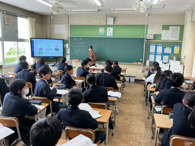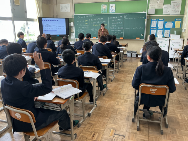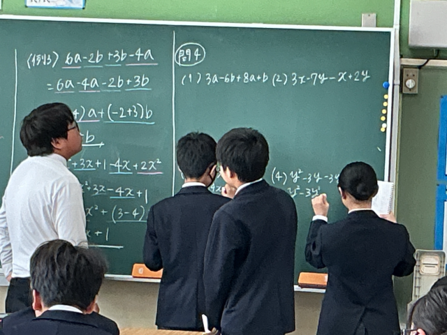 最後に、意欲的に挙手をした生徒たちが黒板に途中式を書き込み、全員で答えとプロセスの確認を行いました。