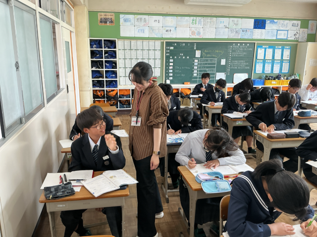 先生は「計算ではなく“まとめる”と捉えてみよう」と優しく語りかけ、一つ一つ丁寧に途中式を書くことの大切さを強調しました。教室を回りながら質問に丁寧に答えたり生徒のつぶやきを拾って褒めたりと、それぞれの理解度に合わせた学びをサポートしていました。