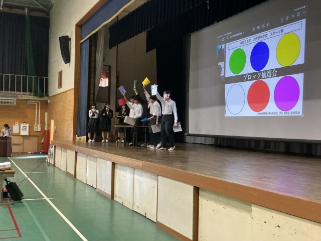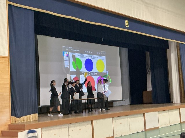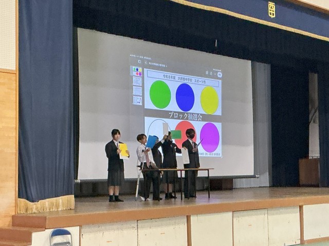 5月29日(金)に行われるスポーツ祭に向けて、縦割りブロックを決める色別抽選会を行いました。赤、白、青、黄、緑、紫の6チームに分かれます。1年生から順番に、各クラスの代表が封筒の中のカードを引き、色を決定していきました。早速、3年生の団長6名が同じ色の仲間に呼びかけて声を出し、士気を高めていました。素晴らしかったです。本番に向け、各団の団結力を高めていってほしいです。