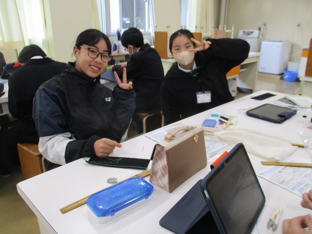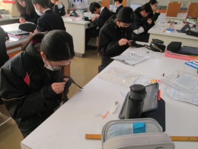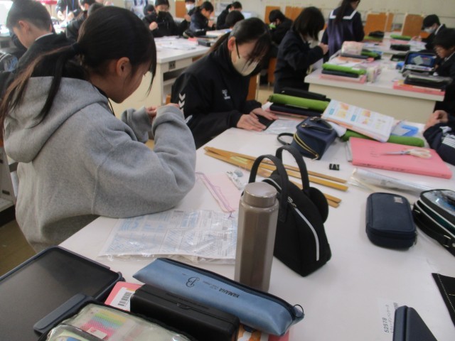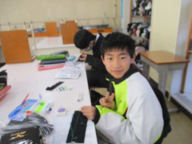 1年生の家庭科の授業です。家庭科室で実習をしていました。「スウェーデンペンケース」を作っているそうです。今日は「まつりぬい」や「刺繍」をしていました。ペンケースには、刺繍で飾り付けをするみたいです。いろいろな図柄を選んで練習していました。世界で一つだけのペンケースができあがるのが楽しみですね。