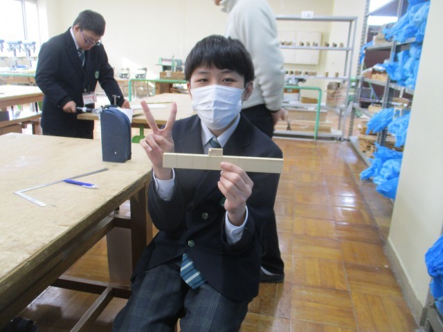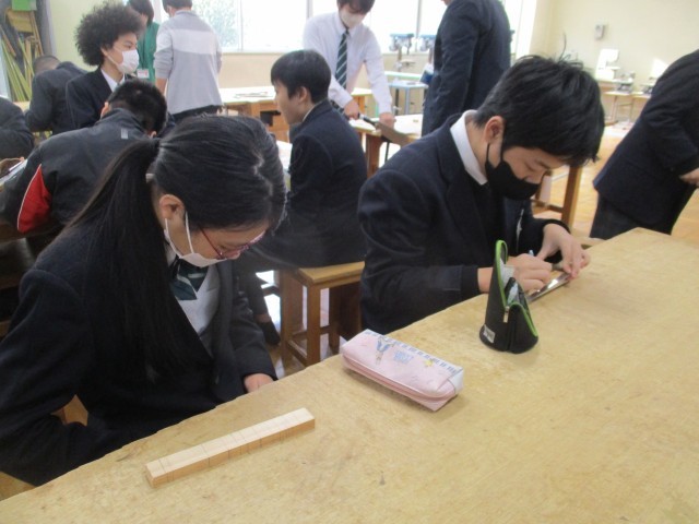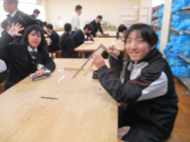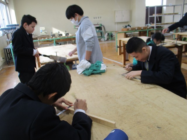 おおぞら学級の技術の授業です。角材に「さしがね」を使って線を引き、線に沿って角材をのこぎりで切っていました。「さしがね」という定規みたいなものは、私も名前がわかりませんでしたが、子どもたちが教えてくれました。これから作品を作っていくのかな?と思います。