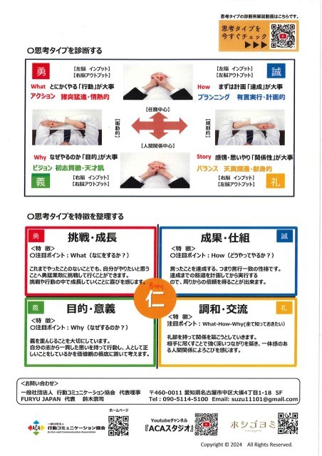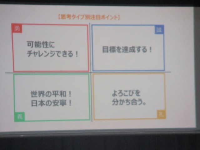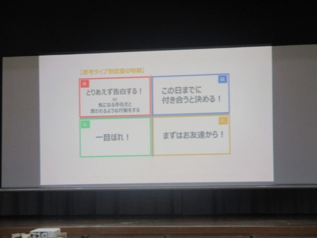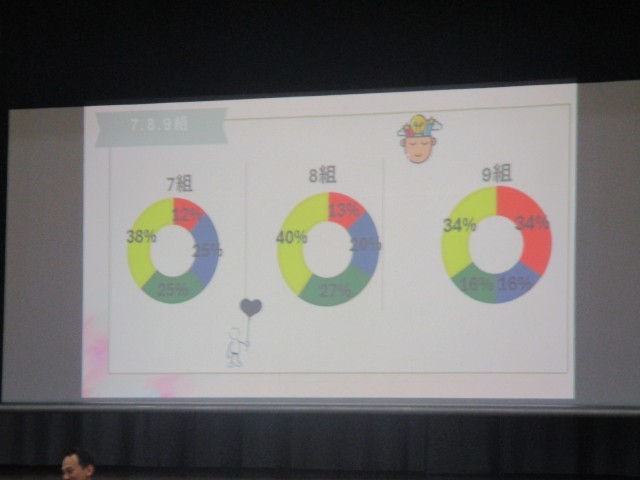腕を組んだり手を組んだりして、自分の思考のタイプがわかります。子どもたちも先生も自分がどのタイプかわかるよう赤、青、黄、緑のカードを持っていました。そして、それぞれのタイプの「友達の作り方」「強み」「恋愛アプローチ」の方法を教えてもらい、そのことについて子ども同士でも話をしました。とても盛り上がる学校保健委員会になってよかったです。それぞれの強みを生かす学級、学年になったらいいなと思いました。