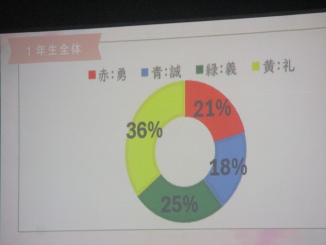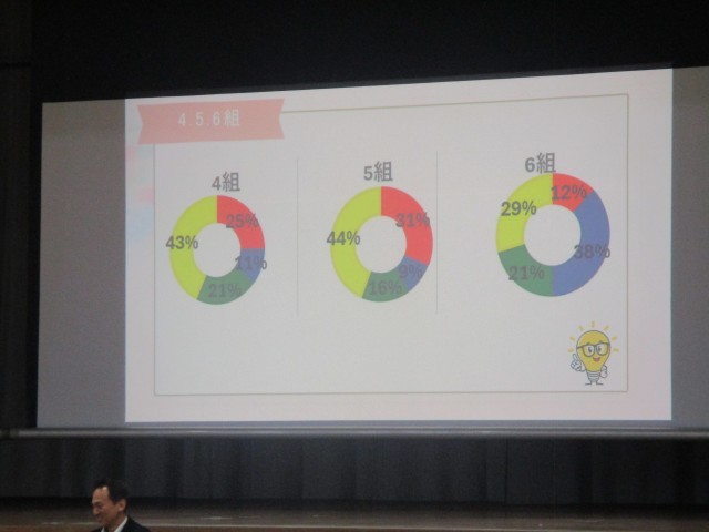 学校保健委員会が1年生とおおぞら学級を対象に行われました。「行動コミュニケーション」について講演をしていただきました。人間には考え方のクセがあり、それぞれが違うが、その違いを知り、お互い補い合うとよいのではないかという話をしてくださいました。人間の考え方や行動パターンは、脳の働きによって4つのタイプに分けられるそうです。1年生全員と先生も事前に4つのどのタイプになるかを調べていました。学年全体と学級ごとのグラフを保健委員が発表していました。