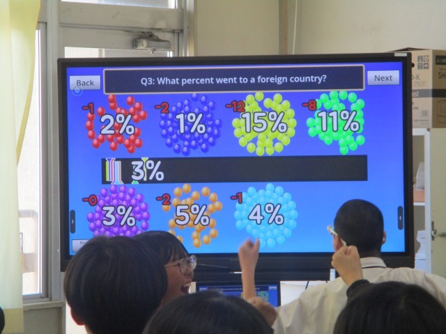 1年生の英語の授業です。ALTの先生が「冬休みに外国に行った人」や「映画を見た人」の割合を聞いていました(もちろん英語で)。子どもたちはグループに分かれて話し合い、「何パーセント」かを答えていました(もちろん英語で)。とても盛り上がっていました。