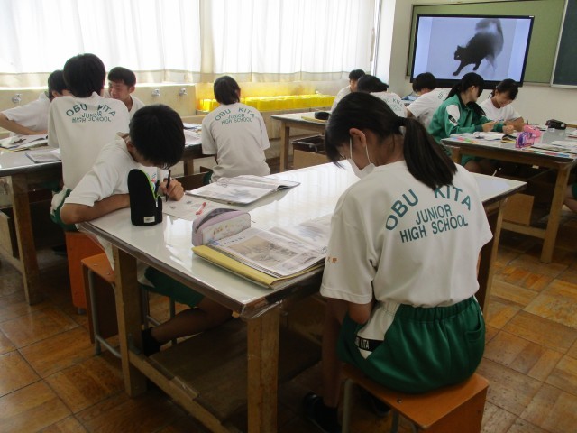 2年生の美術の授業では、絵の表現の工夫について学習していました。教科書や電子黒板の画像を見て、どういう工夫があるかをプリントに書いていました。私は絵が苦手なので、見た瞬間「わぁ、すごい!」と思っただけですが、生徒の中には「ぼかしがあることで奥行きを感じる」と書いている子がいて、感心しました。