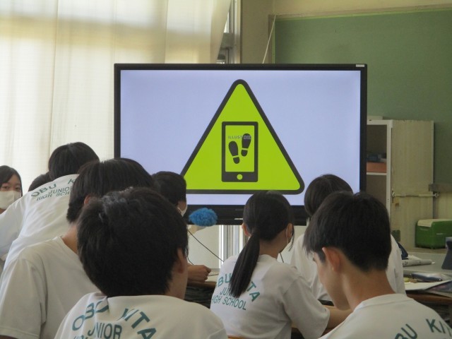 3年生の英語の授業では、画像を見て答えていました。写真のマークは「歩きスマホ注意」のマークだそうです。そして、今日の授業では「歩きスマホ」について、英語で意見を言うそうです。すごい!「英語で話すときは、英語で物事を考える」といいますが、国語教師の私は、まず日本語でしっかりと自分の意見をもってほしいと思います。