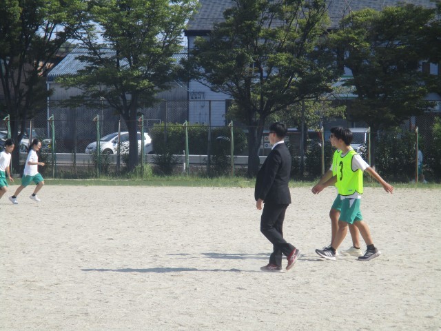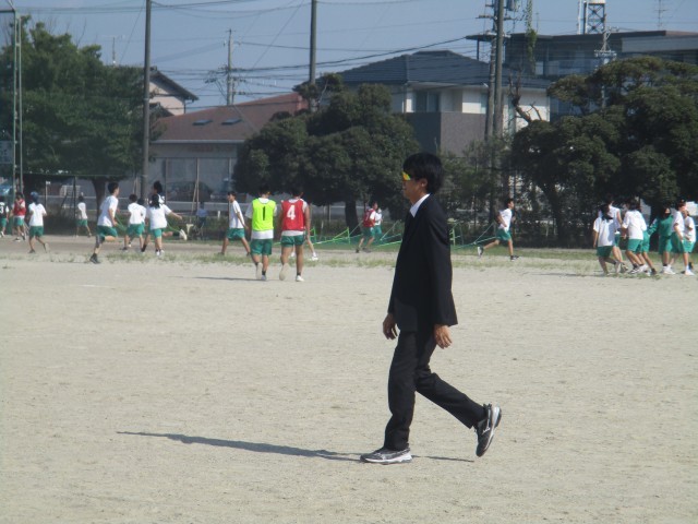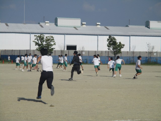 3年生が「学年レク」をしています。最初はドッジボールをやっていたようですが、6限は「逃走中」をやっていたようです。スーツを着てサングラスのハンターはどうも先生たちのようです。ビブスを着た子もいたので、こちらは生徒のハンターかな?と思います。