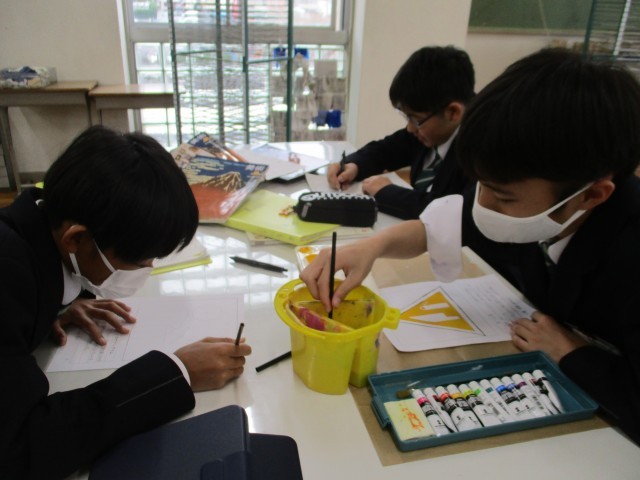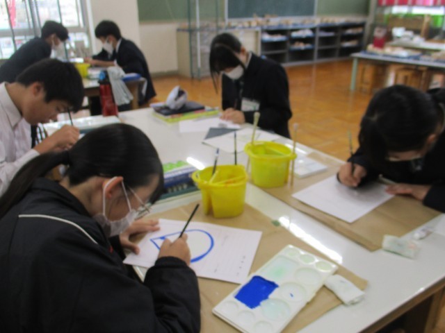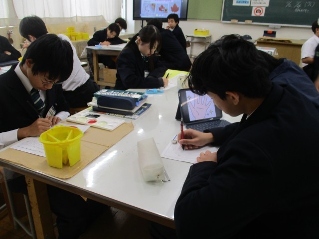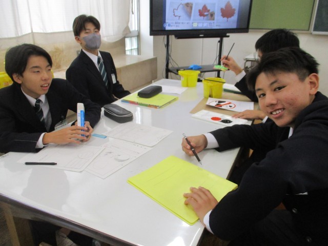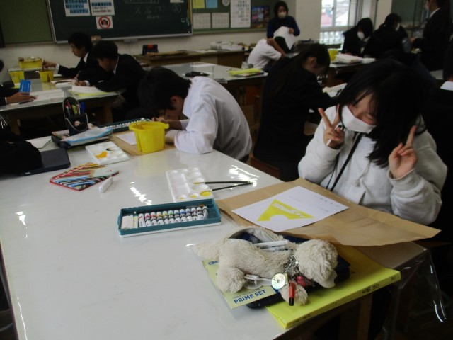 2年生の美術の授業です。ピクトグラムを描いていました。ピクトグラムは、1964年の東京オリンピックのときに、海外から来た方たちに分かるように作られたもので日本発祥だと聞きました。オリジナルのピクトグラムを描いているようです。できたら、校内に飾りたいという声もあり、「それは実現させたい」と考えています。