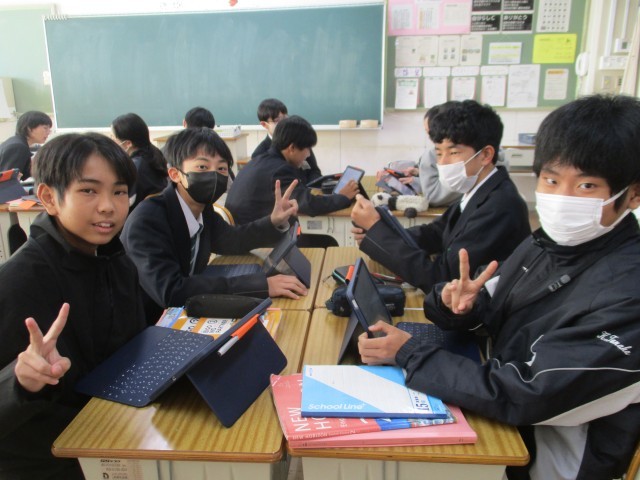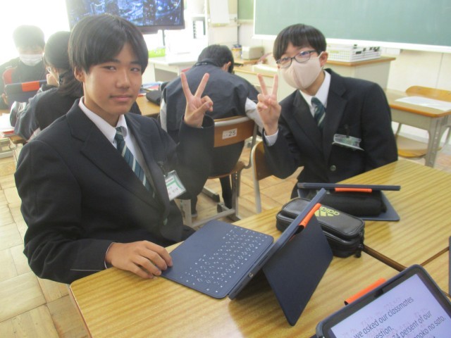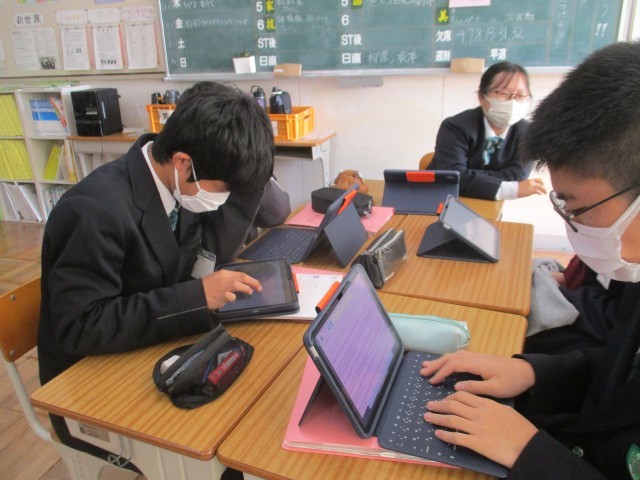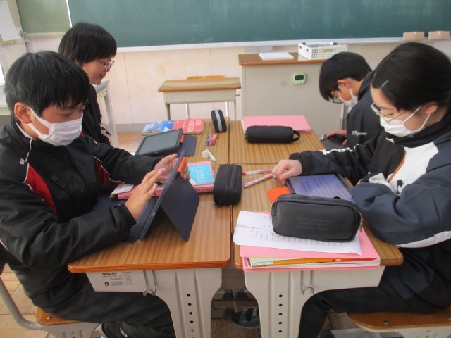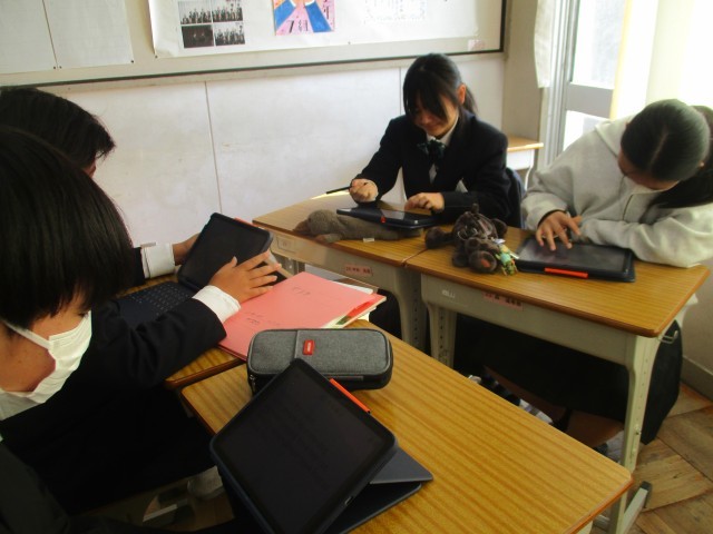 2年生の英語の授業です。英語の授業も発表の練習をしていました。1班ずつ先生からアドバイスをもらっていました。日本のことを話そうとすると、「これは、外国ではないんだ」と発見することがあります。日本と外国を比較して、外国について知ったり日本を再発見したりすることも英語の学習の一つです。このときの学習を思い出して、海外に出かけたときに会話ができるといいなと思います。