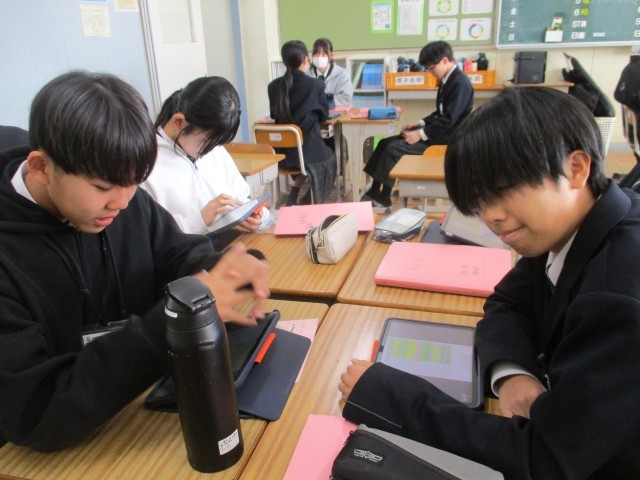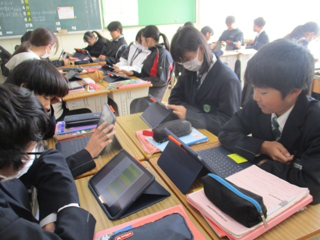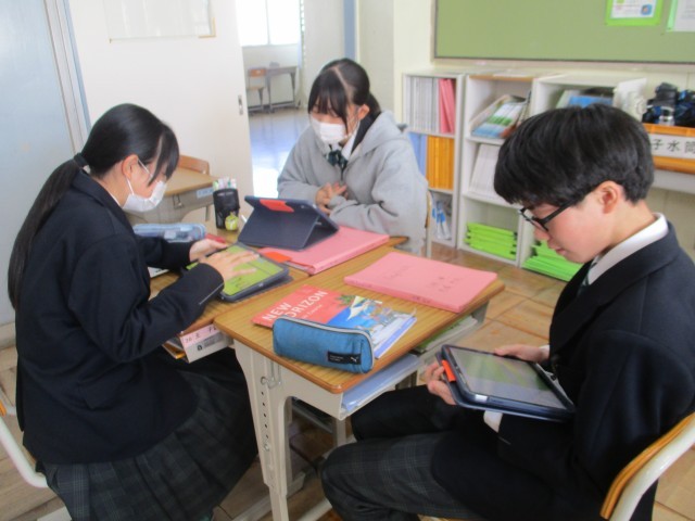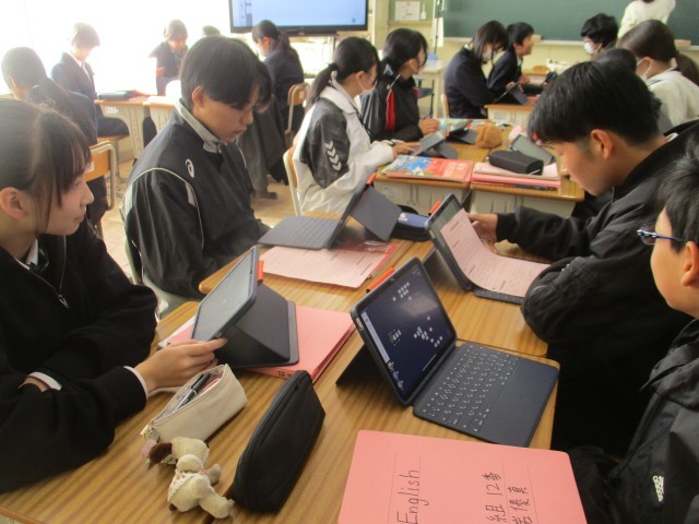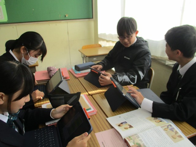 2年生の英語の授業です。グループで、英会話を読み合っていました。練習した後、タブレットに英会話を録音していました。先生からは「音声だけになるから、練習より大きな声で、そして抑揚をつけて」というような指示が出ていました。みんなけっこう流ちょうに英語を話していました。