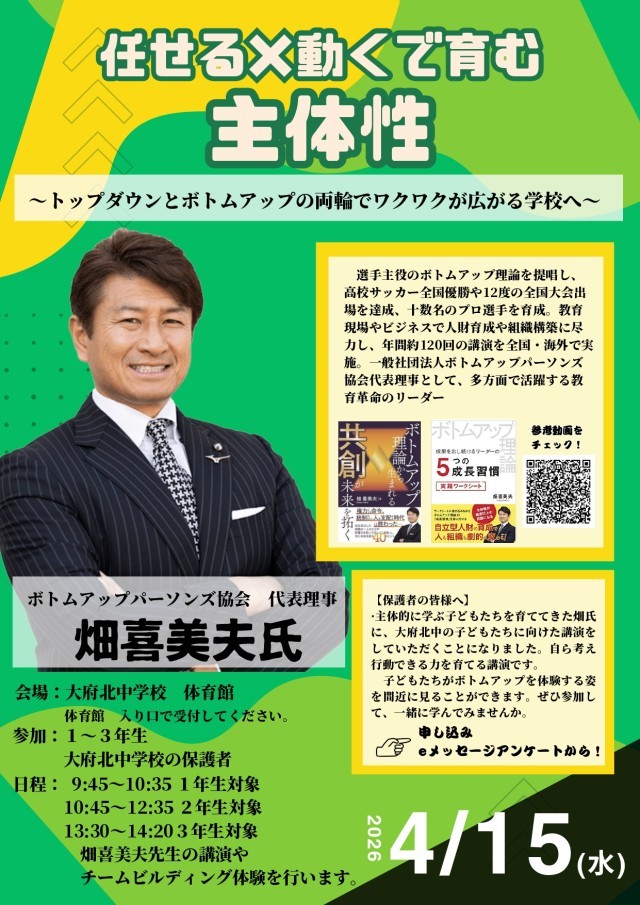 本校では、現職教育の一環として、第1回学校保健委員会と合同で講演会を開催いたします。本講演会では、生徒の心身の健やかな成長や主体的な生活の在り方について理解を深めることを目的としております。教職員の資質向上はもとより、保護者の皆様にとっても有意義な機会となることを願っております。なお、講演会の詳細・参加申し込みにつきましては「Home & School」に配信してありますのでご確認ください。