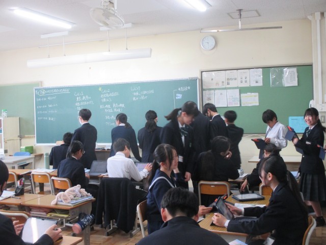 本日は45分授業で、午後には内科検診や任命式が予定されています。授業では、話し合い活動を取り入れながら、生徒同士が意見を交流し、学びを深める様子が見られました。週のまとめの一日として、落ち着いた雰囲気の中で学校生活を送っています。