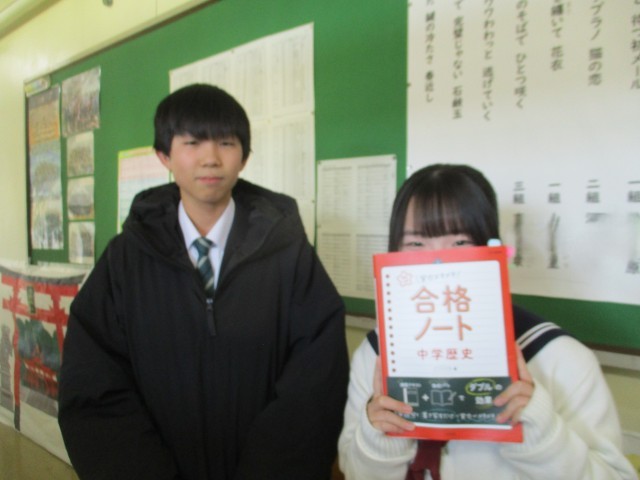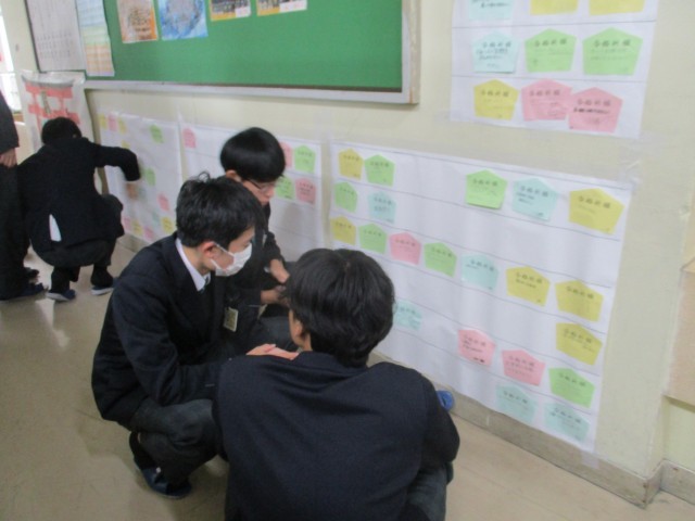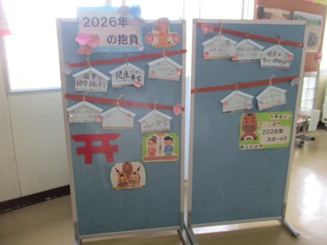 2,3年生の廊下には、新年にふさわしい掲示物がありました。学活も合わせた活動をしていました。2年生は「今年の目標」を書いていました。3年生は廊下に合格神社というものがあり、それぞれ絵馬に目標を書いて貼っていました。1年生もずっとゲームをしていたわけではなく、「今年の目標」を書いたと言っていました。