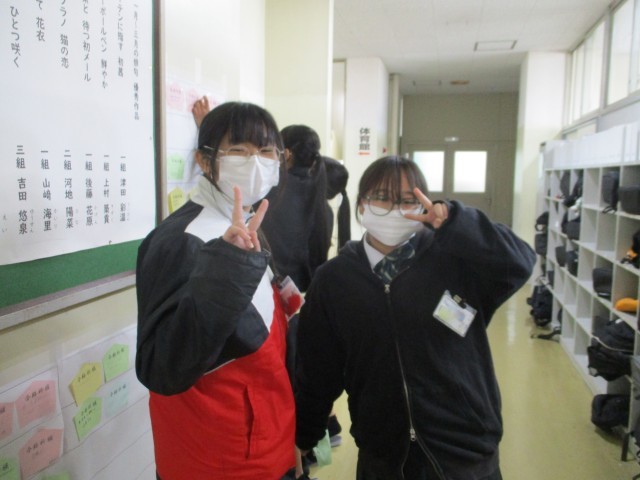 3学期最初のあいさつ運動がありました。2年生の学級委員会の子たちです。楽しくあいさつ運動に参加しています。昨日の職員会議では、「みんなであいさつ運動キャンペーン」についての提案がありました。また教室で動画を見たことと思います。自分から「あいさつ運動がしたいな」と思った子たちが来てくれるとうれしいです。