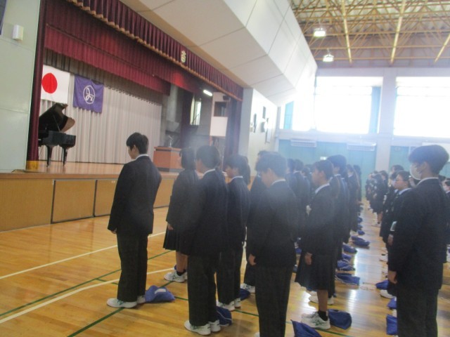 いよいよ3月に入りました。今日は、公立高校の卒業式がありました。本校でも今週の金曜日に卒業式があります。今日は、1,2年生の練習がありました。最初に先生から「卒業式」についての説明がありました。卒業式は、学校で最大の行事です。大府北中学校の校訓のとおり「誠実」な卒業式になるといいなと思っています。