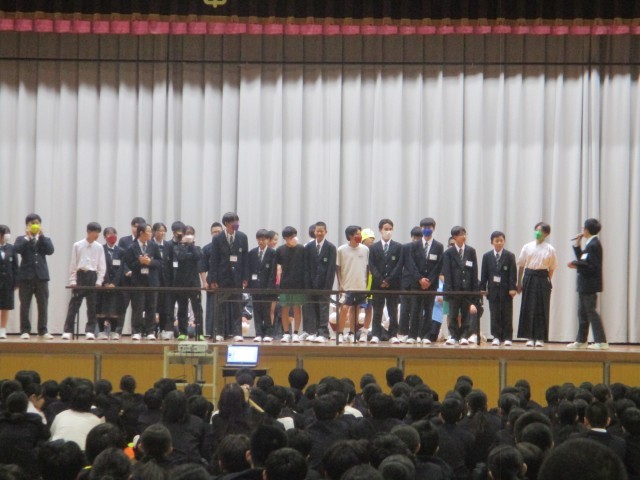 この後がとても感動的でした。2年生の生徒からの「祝福の言葉」は涙ながらのメッセージとなりました。そして、3年生からのお返しが合唱でした。いつのまに練習したのか、「正解」を体育館に響かせてくれました。しかも、肩を抱き合いながら歌っている姿があり、とても心に残りました。最後に3年生の生徒からも1,2年生に温かいメッセージがあり、とても素敵な会でした。
